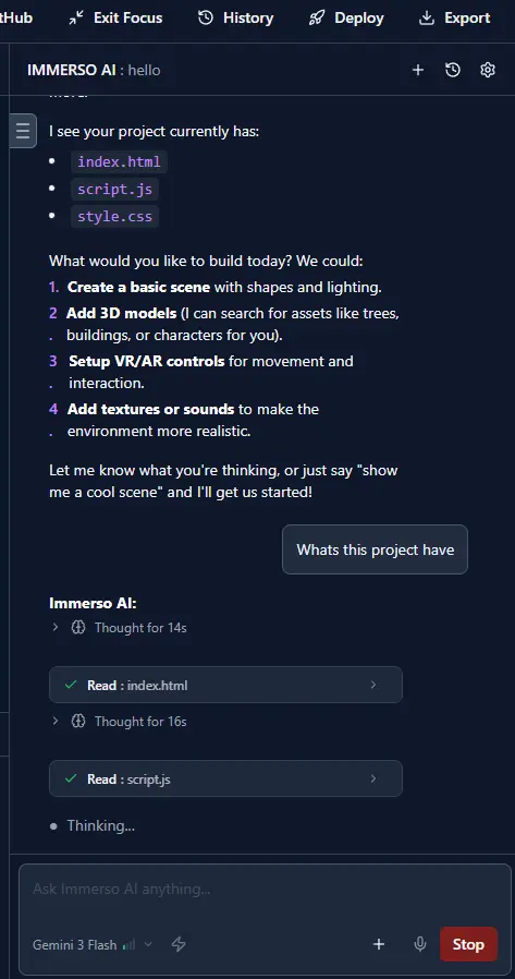 | Build XR from scratch | Start a new project and chat with the AI to build your scene |
