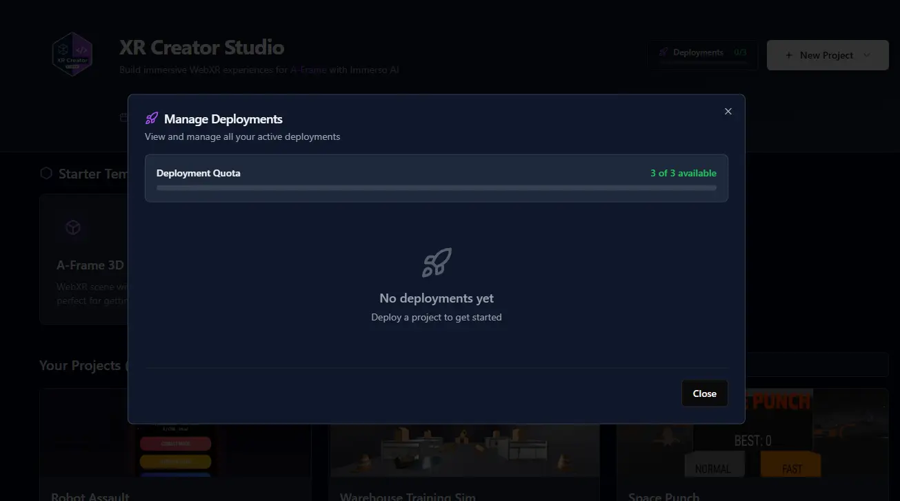 - One-Click Deploy β Publish your XR experience to a live URL with one click (powered by Netlify)